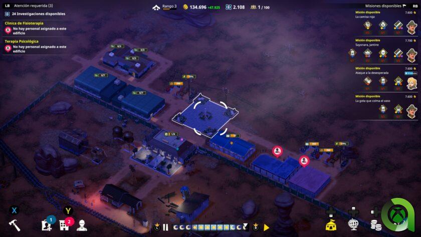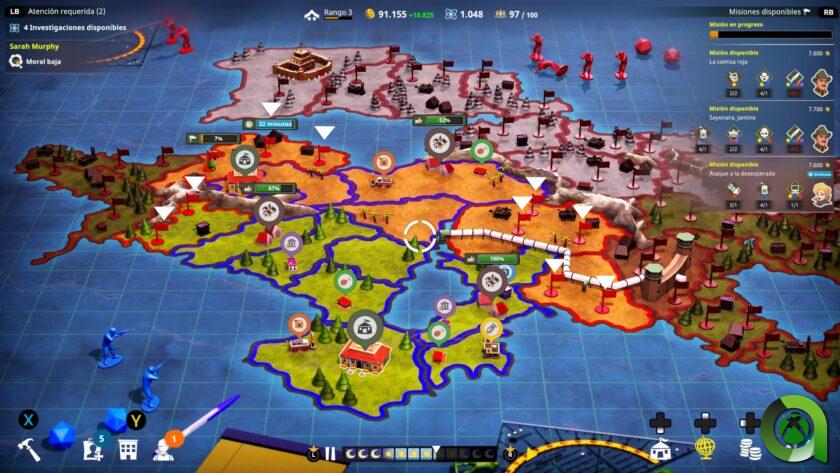 La navegación por diferentes menús la haremos exclusivamente con el joystick izquierdo, cambiando entre pestañas con la cruceta. Con los gatillos LT y RT podremos observar a la distacia que deseemos los diferentes edificios de nuestra base militar. En cuanto al mapa del mundo, el joystick izquierdo volverá a ser nuestro aliado para movernos a través de las diferentes misiones a las que podemos destinar a nuestras tropas entrenadas para lograr (o no) el objetivo.