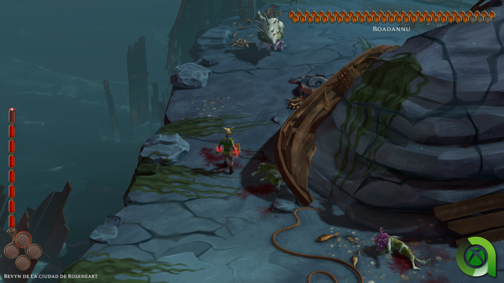 Ya dentro de la mazmorra, el juego se desenvuelve con unos controles sencillos pero que requerirán tiempo hasta dominarlos. Contamos con dos tipos de ataques, uno ligero y otro pesado. A parte de esto, tenemos un botón con el que poder dashear y otro para saltar. Este dash, se puede utilizar a su vez para realizar un contraataque. Cuando un enemigo vaya a iniciar su ataque, si dasheamos hacía él, podremos realizar un parada perfecta, lo que nos permitirá acabar rápidamente con el enemigo.