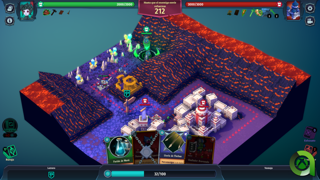 Las cartas de nuestro mazo, se pueden dividir en tres tipos, por un lado tenemos las criatura, por otro los conjuros y por último las de un sólo uso. Tendremos que gestionar muy bien el uso de nuestras cartas, ya que además de nuestro nexo, el mapeado cuenta con un castillo enemigo que tendremos que destruir. Sobra decir que del castillo comenzarán a salir diferentes criaturas, cada una con sus características propias.