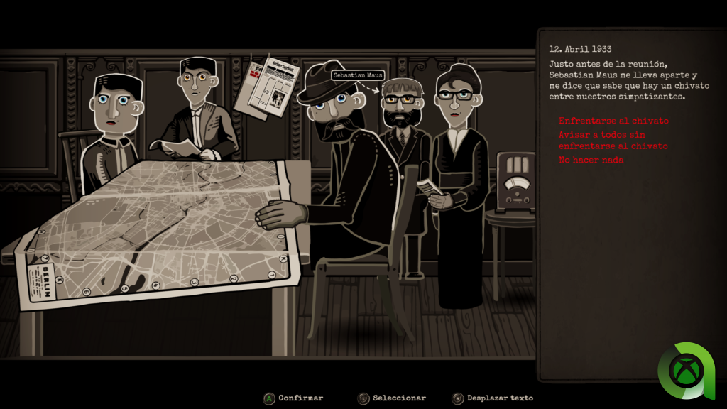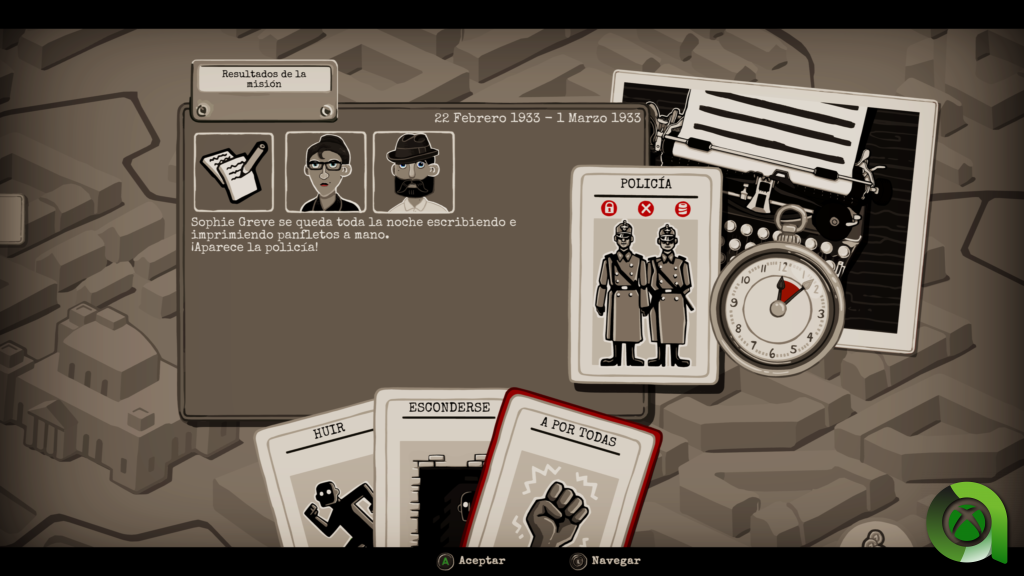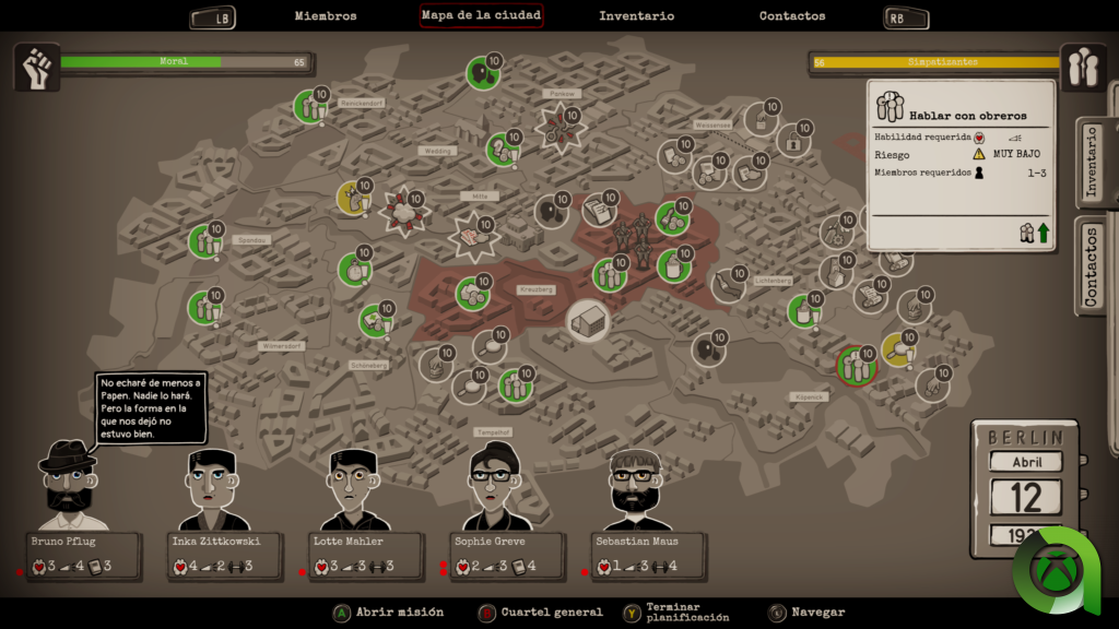 Después veras el mapa de Berlin, en el cual se encontraran todas las misiones que puedes elegir. Las mismas dependerán de ciertas cosas. Una misión por ejemplo es comprar papel, para hacerla requerirás Marcos (La moneda Alemana) para que te aparezca como opción. Si quiere hacer panfletos de propaganda, requerirás tener papel del que compraste antes. Otras se desbloquearán dependiendo de la cantidad de simpatizantes que tengas. Al superar algunas misiones, tendrás la oportunidad de reclutar miembros para el equipo. Es importante que analices las cualidades que faltan en tu equipo y elijas a los personajes que las tengan. La resolución de las misiones dependerá de estas cualidades.