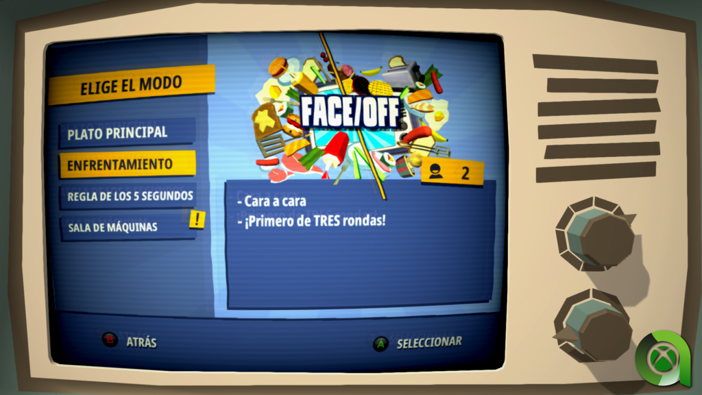 Con respecto a los modos de juego, existen cuatro diferentes, todos ellos disfrutables en compañía o en solitario. El «Plato Principal», consiste en preparar las comidas que se nos plantean en un tiempo récord. Con «Enfrentamiento», jugaremos un uno contra uno de la misma forma que en «Plato Principal», solo que mediante tres rondas. La «Regla de los 5 Segundos» consiste en alcanzar los puntos de control señalados con el alimento que se nos asigne. En este modo, es altamente recomendable jugar con otra persona, pues resulta muy complicado hacerlo de manera individual. Por último, en «Sala de Máquinas», encontraremos una colección de minijuegos competitivos, ideal para la experiencia más arcade.
