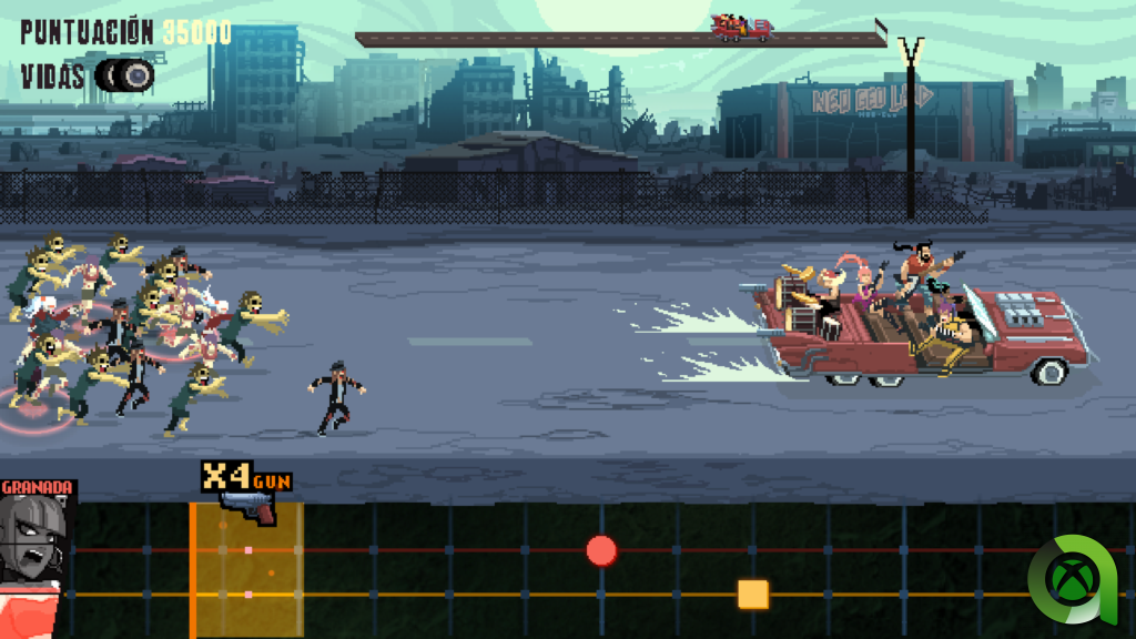 Las estéticas de juego son del estilo de 16 bits. Me parece acertado sobre todo para el público al que desean llegar. El diseño de los enemigos, armas, vehiculó y personajes es muy bueno. Logran dar el feeling de un comic, recordándome un poco a los gráficos vistos en el juego arcade de Scott Pilgrim Vs The World del Xbox 360. Al ser un juego rítmico, el apartado de Sonido es en el que más se destaca. Las canciones elegidas por el equipo son muy buenas y requerirán de que puedas seguir el ritmo.
