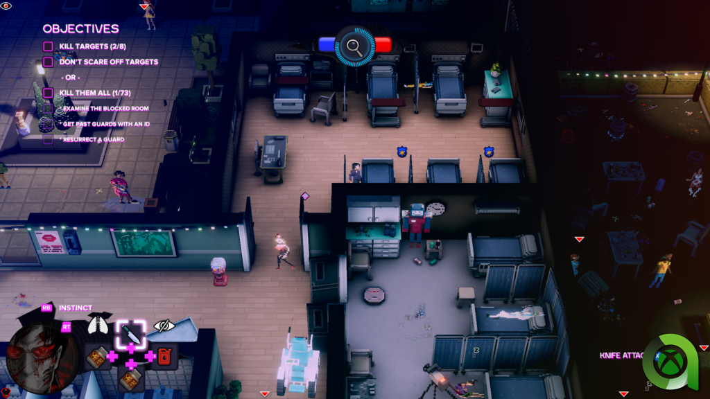 Una mecánica que no observé hasta bien avanzado el juego es que, podemos intoxicar a los fiesteros, paralizar a guardias de seguridad con pistolas eléctricas, o utilizar ciertos objetos a algunos NPCs para que nos empiezen a seguir.