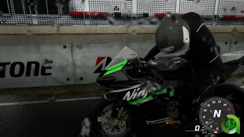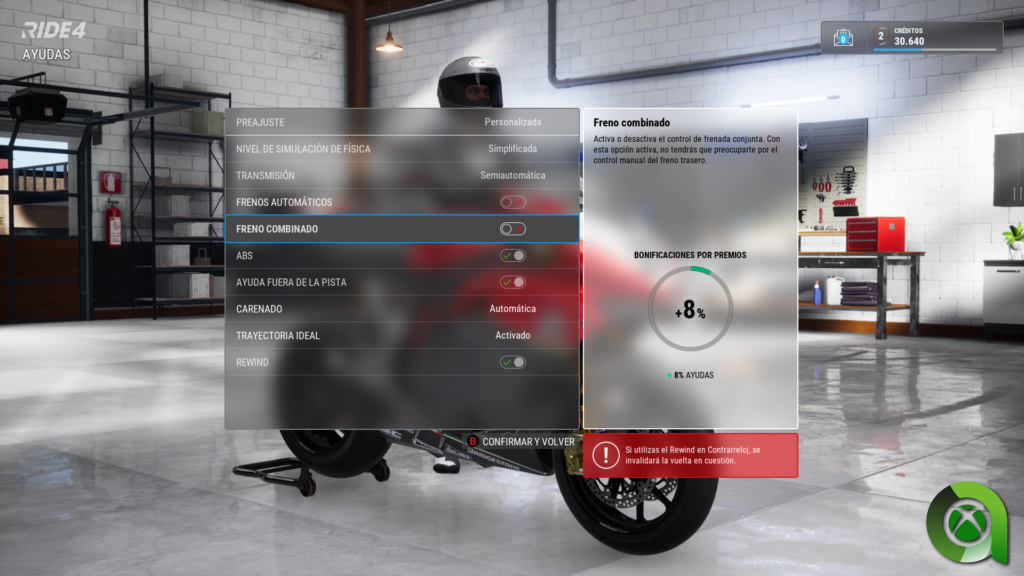 Para que os hagáis una idea, pueden controlarse ambos frenos de forma individual. También están la típica línea de color para la trazada, el abs o la inclinación del piloto entre otras cosas. También podemos facilitar el manejo para cuando nos salgamos de la pista, algo que conviene especialmente cuando corramos bajo la lluvia. En estas condiciones, el asfalto es muy resbaladizo. Por otra parte, el desgaste de los neumáticos influye de igual manera, dependiendo de lo agresivo que sea nuestro pilotaje. Por suerte, también cuenta con la opción de rebobinado, similar a la de Forza.