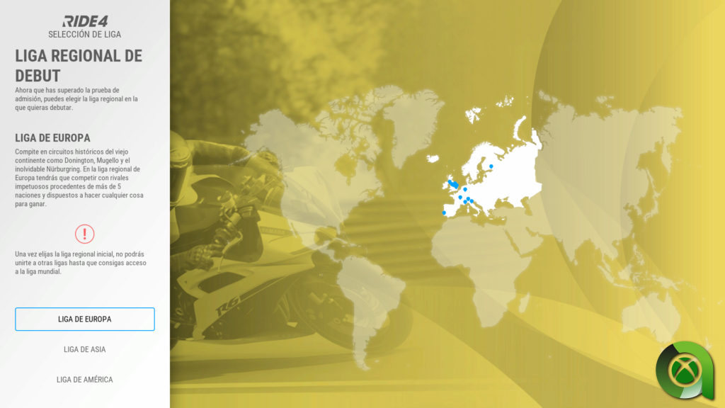 Podría decirse que el modo Trayectoria es la estrella de RIDE 4. Un modo de lo más completo, donde competiremos en los circuitos de todo el mundo para ascender en sus diferentes ligas. Tras superar algunas pruebas de iniciación (contrarreloj principalmente), podremos elegir una de las tres ligas para empezar a competir; la de Europa, la de Asia o la de América.