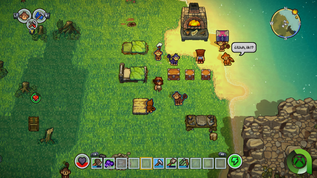 Pero bueno, ¿Qué pasa si quiero jugar solo? No te preocupes, también puedes buscar ayuda por ti mismo. Y es que, una de las mecánicas más originales del juego reside en poder domar monos y enseñarles a hacer ciertas acciones. Con un sistema muy simple de aprendizaje vicario, donde el jugador hace una acción y el monete aprende, podremos hacer auténticas virguerías para facilitarnos el trabajo.