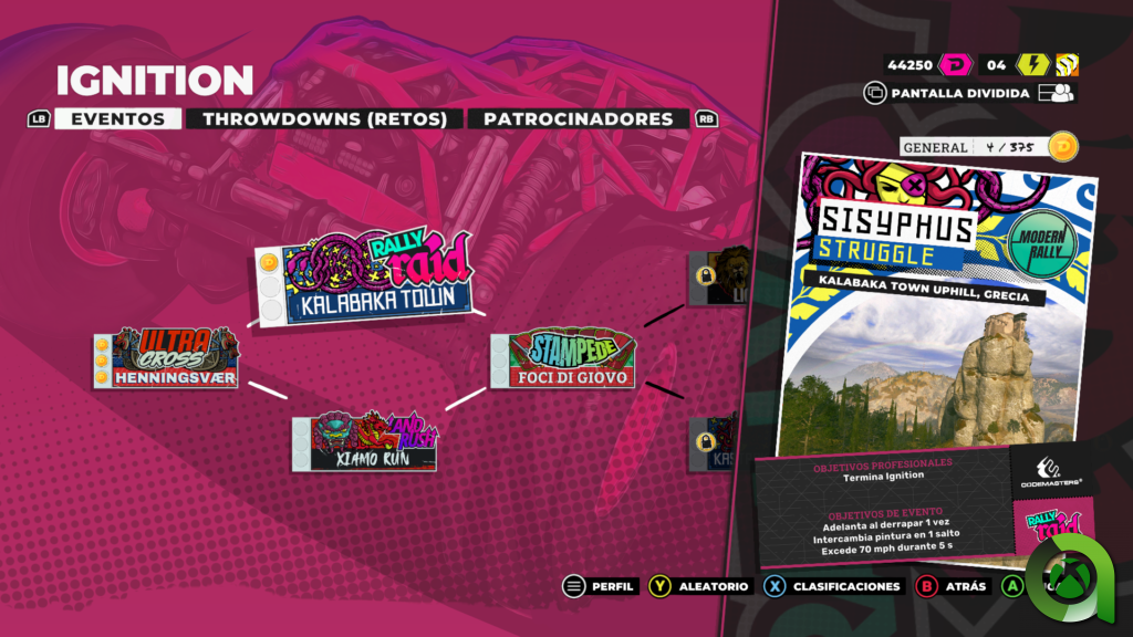 No esperéis piezas ni cualquier otro elemento mecánico para el coche. Toda esta personalización se reduce a lo que veis, a lo estético. No hay mejoras de suspensión o motor, llantas nuevas, alerones ni neumáticos. DIRT 5 es un juego directo en el que el usuario no tiene que «comerse» la cabeza para ponerse a jugar.