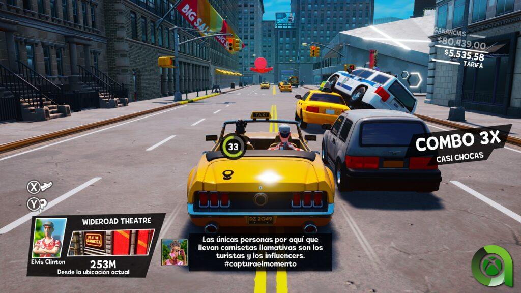 El manejo de nuestro taxi es muy simple, gatillo izquierdo para frenar, derecho para acelerar y el botón A para saltar. Si pulsamos los dos gatillos a la vez tendremos un arranque mas potente que nos dará un mayor impulso de salida una vez soltemos el gatillo derecho. Los saltos a su vez nos ayudaran a esquivar el trafico y buscar atajos. Con el salto también podremos acceder a los tejados de los edificios en busca de coleccionables y misiones extra para aumentar nuestros logros. Utilizando todas las técnicas iremos haciendo combos que subirán nuestro contador, cuantos más combos mayor la recaudación.