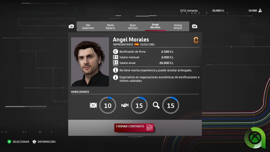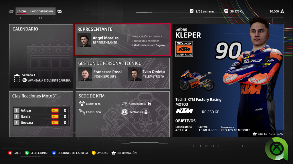 MotoGP 21 ofrece los modos de juego ya conocidos, aunque en este análisis me centraré especialmente en el más importante, el modo Trayectoria. Este suele ser el modo en el que los desarrolladores implementan más novedades cada año, o bien explotan aun más las características que ya poseía. Ya el juego ofrecía multitud de elementos que hacían muy completa la experiencia en entregas anteriores. Y en esta ocasión, la gestión combinada con el gameplay puro y duro de las carreras, es una propuesta redonda. Nada más empezar, tendremos que elegir a nuestro representante. Los posibles candidatos contarán con tres habilidades principales, cuyo nivel varía de unos a otros. Estas consisten en buscar nuevos equipos, aumentar nuestros beneficios, y lograr el éxito en las negociaciones.
