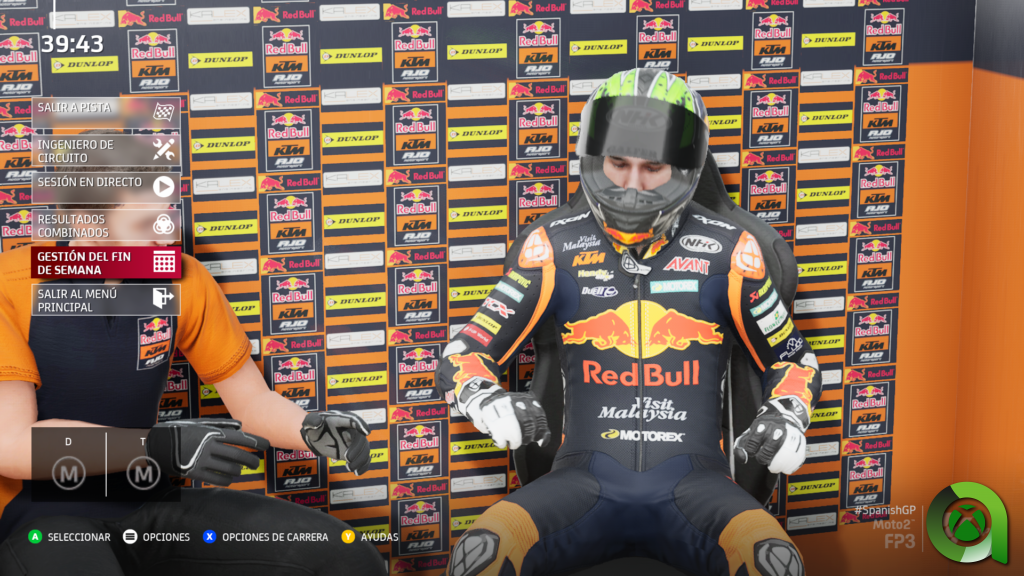 En pleno fin de semana de carreras, las opciones de gestión con la moto son las mismas que podremos encontrar en el modo Nuevo Gran Premio. A nuestra elección queda pasar por cada sesión de libres y clasificación o ir directamente al día de carrera, aunque lógicamente recomiendo la experiencia completa. Además durante el fin de semana, tendremos objetivos que cumplir para las investigaciones de nuestro ingeniero. Dar un número concreto de vueltas, mejorar tiempos, y otros objetivos sumarán para mejorar en pista y fuera de ella.