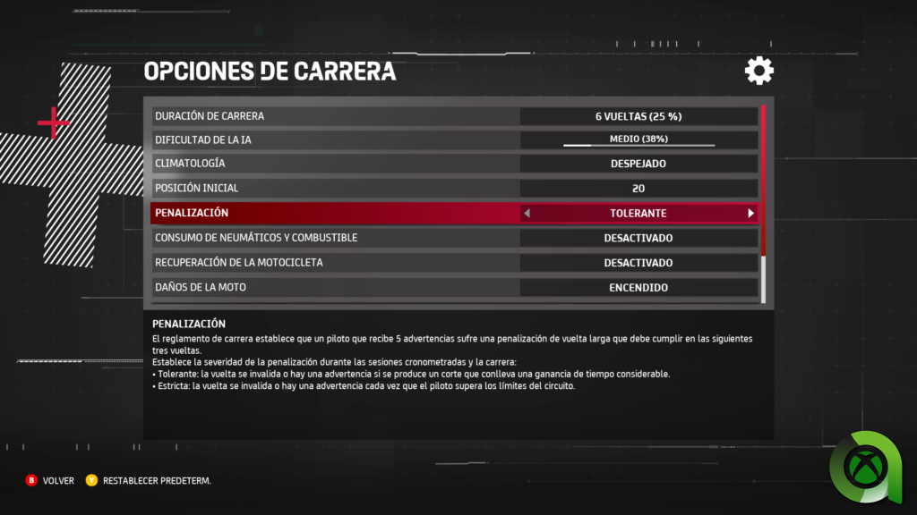 Antes de salir a pista, podemos escoger el juego de neumáticos y la carga de gasolina. En el caso de las cubiertas, estas se irán desgastando en mayor o menor medida dependiendo del compuesto y la temperatura. En Losail, por ejemplo, la pista no baja de los 38-40 grados, por lo que es conveniente reservar los neumáticos duros para la carrera, y aprovechar los blandos y medios para los libres y la clasificación. De hecho, no durarán mucho más de dos vueltas. Con la gasolina, la cosa se complica. En las innumerables horas que ya le he dedicado al modo Trayectoria y a practicar por libre, no he logrado acabar las carreras. Incluso tratando de ahorrar todo el combustible posible, siempre me ha faltado lo justo para terminar de dar la última vuelta.