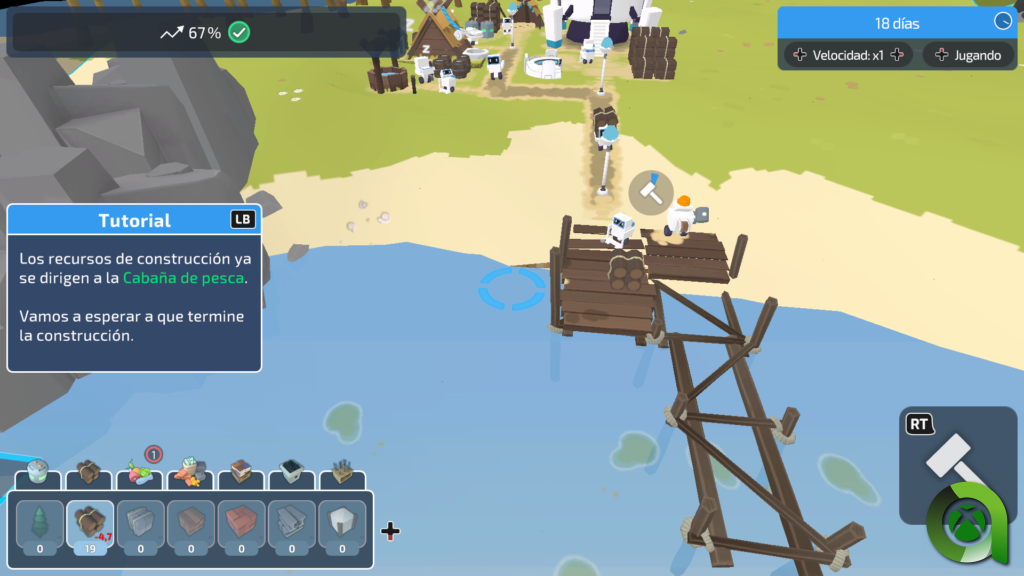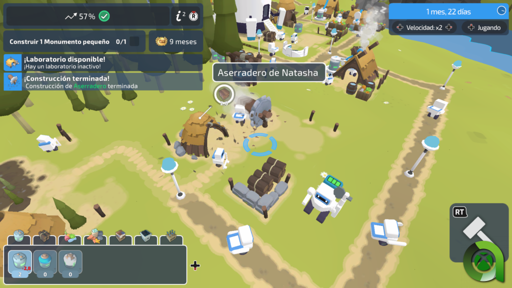 Estas funciones se desempeñan de forma sencilla y ágil gracias a un completo menú radial, similar al que podemos encontrar en otros juegos del género. Con el botón RT abriremos dicho menú, y desde el mismo, seleccionando el apartado de construcción, accederemos a multitud de ramas diferentes. Producción de alimentos, investigación, transporte, cualquiera de ellas nos facilitará llegar al edificio o instalación que necesitemos. Por poner un ejemplo, algunos de los primeros recursos que necesitaremos en nuestro asentamiento los obtendremos al construir la cabaña de pesca, la cabaña de leñador o el centro forestal. Una vez construidos, también podremos gestionarlos para que los robots inicien o frenen su labor en función de nuestras necesidades.