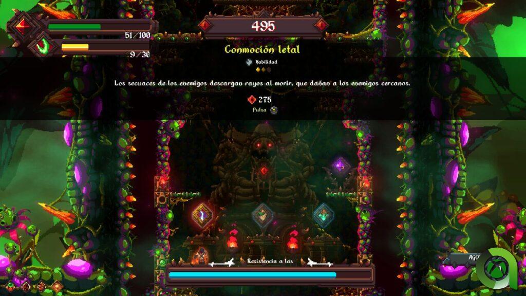 Y otro punto importante que acabamos de nombrar son las almas verdes. Serán muy trascendentes en nuestra aventura puesto que sirven como recuperador de vida. La vida es algo que en las primeras fases no nos fijaremos en demasía, pero al avanzar en el juego, se nos hará cada vez más necesaria dada la progresiva dificultad de los enemigos. A ello se une que entre las distintas fases no tendremos recuperación de vida. Si bien se nos ofrece tras posibilidades en forma de recompensa al acabar cada fase: almas rojas, almas verdes o gemas moradas.