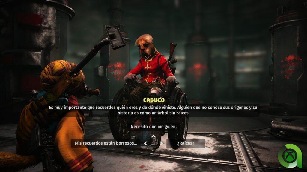 Dicho esto, puede que estés pensando que no está nada mal la premisa de Biomutant, de hecho no creo que la historia en sí sea un problema. Sin embargo, cómo se cuenta la historia sí que es un problema, es más posiblemente sea el mayor error del juego. La historia llega a nosotros a través de un narrador que nos contará todo lo que ocurre a nuestro alrededor, incluyendo las conversaciones que tengamos con los otros personajes del juego. Asimismo, esto genera que los personajes sean mucho más planos, ya que escucharemos la misma voz para todos y cada uno de ellos.