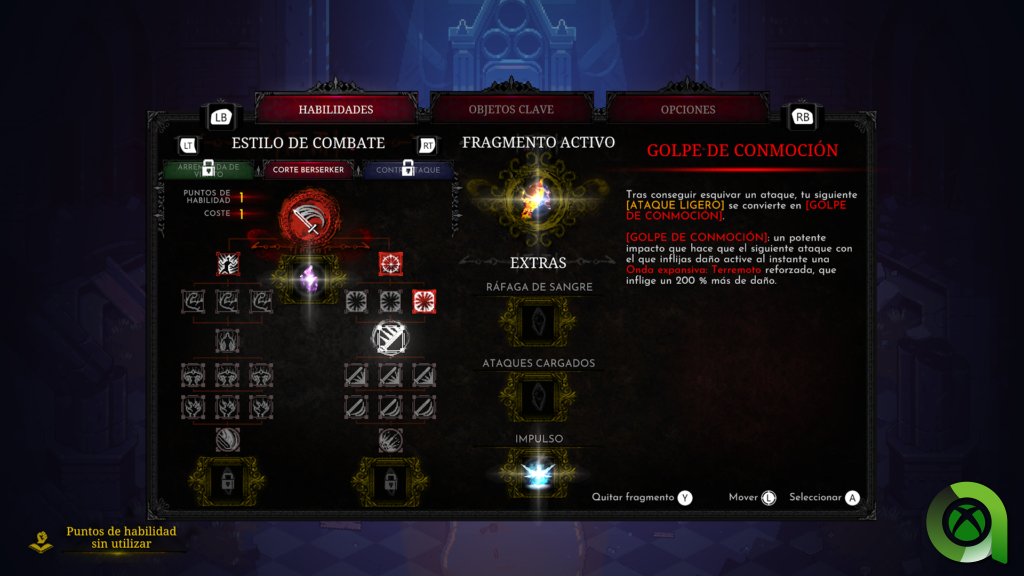 No obstante, aunque el concepto base es muy interesante, termina por diluirse debido a que para poder progresar por el mismo serán necesarios puntos de habilidad. Unos puntos que sólo se podrán obtener derrotando a los diferentes jefes. Igualmente, cuando acabemos con cada uno de estos jefes encontraremos un fragmento de ellos. Estos fragmentos se pueden colocar en diferentes puntos del árbol de habilidades, generando efectos muy variados en nuestro personaje. Como digo, creo que es un sistema interesante y profundo, pero que debido a la limitación que tenemos a la hora de obtener puntos de habilidad puede acabar por diluirse.
