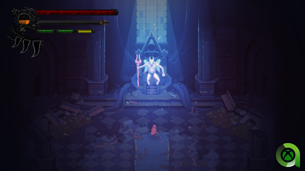 En este sentido, hay que decir que el juego cuenta con un fantástico apartado pixel art. Obteniendo estampas espectaculares en prácticamente todo momento. Aunque si se me permite, tengo que destacar los efectos encontrados en el agua en los primeros compases de la aventura, es un verdadero espectáculo. No obstante, este gran diseño artístico no queda aquí, ya que el gran protagonista de esta aventura no son los escenarios, sino que serán estos poderosos dioses. Aun así, a pesar de que hay diseños muy buenos, hay otros que he sentido que no están especialmente inspirados como es el caso de Eos, entre otros.
