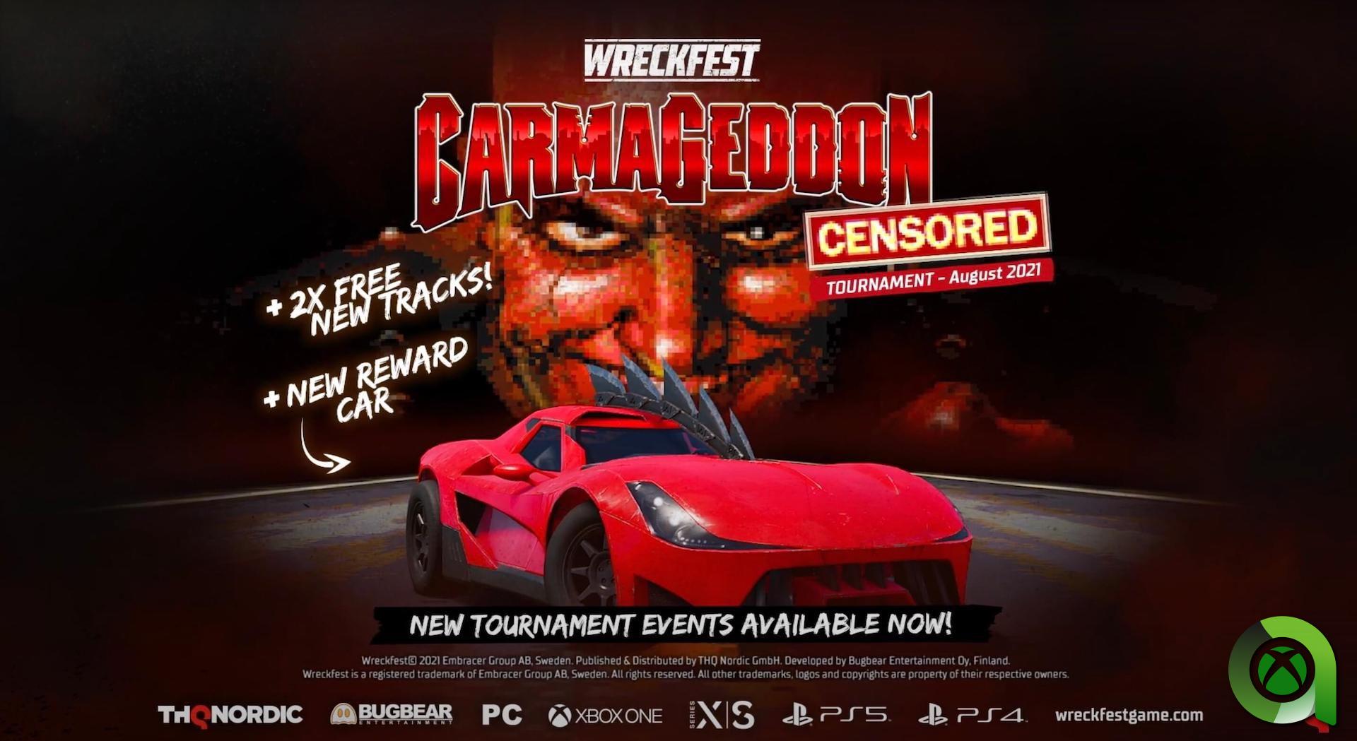 Según un comunicado  de la propia THQ Nordic: “Carmageddon y Wreckfest: ¡una pareja hecha en el infierno! Destrozar a tus oponentes y machacar zombis (y vacas zombis) en veloces coches de carreras es lo que hace que ambos juegos sean igualmente impresionantes, por lo que tenía todo el sentido del mundo combinarlos en un gran evento. El nuevo Torneo Carmageddon llega a Wreckfest a todas las plataformas de forma totalmente gratuita. Los jugadores pueden participar en dos eventos diferentes en las famosas pistas de Carmageddon, “Bleak City” y “Death Canyon”, y desbloquear el icónico auto “Eagle R” de Carmageddon: Max Damage«.