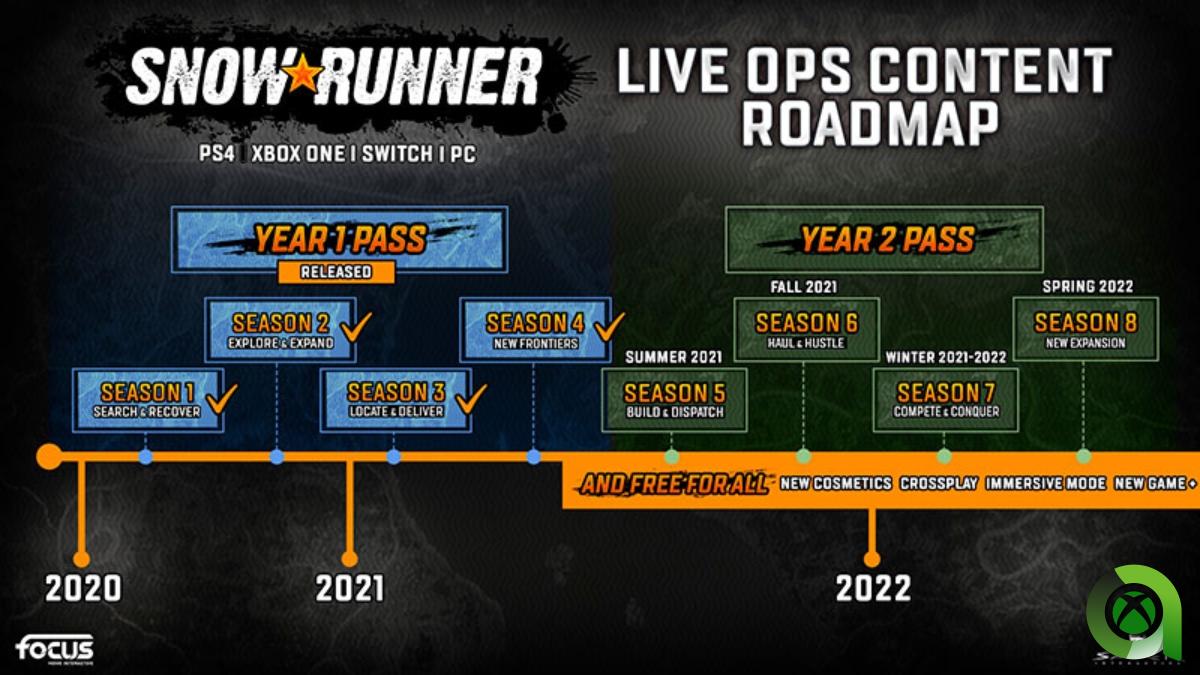 Al más puro estilo SnowRunner, el Pase del Año 2 está repleto de nuevos y emocionantes contenidos repartidos en 4 temporadas. Desde nuevos vehículos, hasta nuevas regiones y actividades, el Pase del Año 2 de SnowRunner Year 2 lo tiene todo. ¡Consigue tu pase ahora para no perderte nunca una fase de nuevas aventuras SnowRunner!. Cada fase planificada de contenido también vendrá acompañada de nuevos contenidos y características gratuitas para todos los SnowRunners. Tendremos cambios cosméticos, New Game+, un impresionante Modo Inmersivo y, por último, pero no menos importante, juego cruzado entre todas las plataformas. Esto comienza con el juego cruzado en PC a través de Steam, EGS y Microsoft Store cuando se estrene la temporada 5, permitiéndonos jugar con más amigos que nunca.