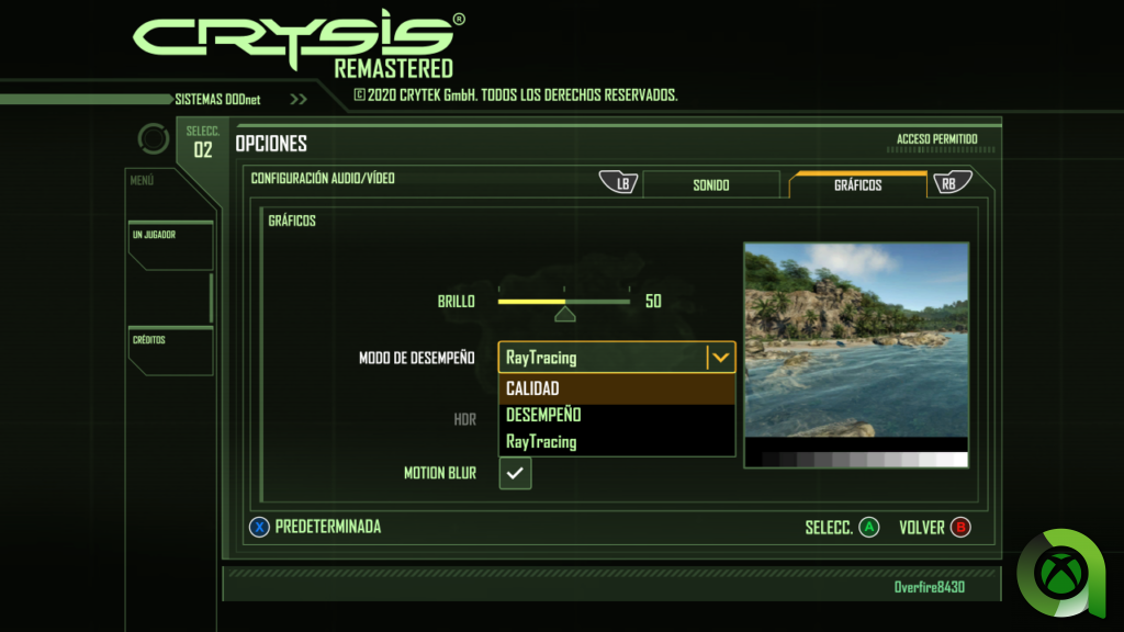 Entre las opciones gráficas disponibles, en el primer título de Crysis tenemos la opción de elegir un modo rendimiento o modo calidad gráfica, así como también el uso de raytracing. Sin embargo, para Crysis 2 y 3 no tenemos ningún tipo de opción gráfica más allá de la inclusión de HDR. Una pena, ya que para consolas de anterior generación hubiera sido de agradecer una bajada en calidad gráfica para aumentar el rendimiento y ganar FPS.
