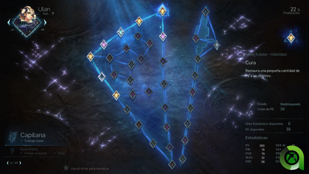 Por otra parte, para conseguir nuevas habilidades o incluso un aumento en los niveles estadísticos de los estados mencionados anteriormente, tendremos el llamado «Árbol de la Ascensión». En este apartado es donde utilizaremos los llamados puntos estelares (PE). Nos aparecerá lo que parece ser una constelación zodiacal, con distintos nodos estelares, los cuales al desbloquearlos ganaremos desde una habilidad, un aumento de estadística del personaje o una habilidad de apoyo. Para los nodos de tipo estadísticos, tendremos que utilizar también un «orbe estadístico», para así desbloquear la característica que más nos interese. Podremos elegir entre aumentar agilidad, fuerza, defensa o puntos mágicos por ejemplo, en función del tipo de nodo estadístico deshabilitado.