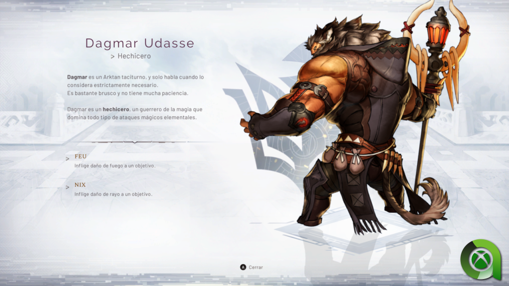 Dagmar Udasse. De la raza de los Arktan taciturno. Habla únicamente cuando lo considera necesario. Bastante brusco y con poca paciencia. Hechicero que controla todo tipo de ataques mágicos elementales.