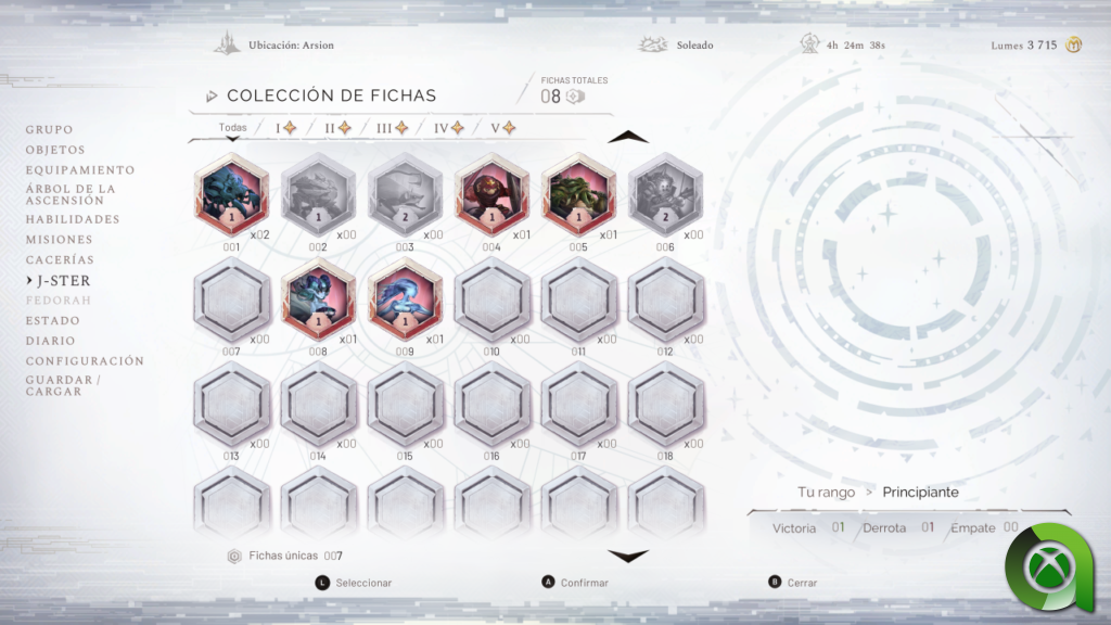 Como buen JRPG, en Astria Ascending encontramos un minijuego de cartas llamado «J-Ster». Sus reglas son muy básicas. Estamos frente un tablero con 7 huecos hexagonales. Nuestras cartas, a modo de ficha hexagonal, deberá ir colocada en uno de estos huecos. Al tocar un lateral de una ficha con otra se produce un enfrentamiento entre ambas. En este punto tendrá mucha importancia el valor de la carta y las posibles debilidades o fortalezas que tenga por el lado que entra en contacto con la otra ficha.
