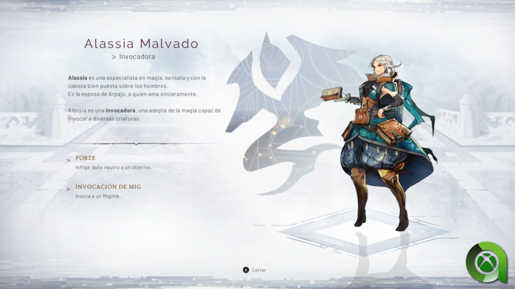 Alassia Malvado. Invocadora especialista en magia. Sensata y con la cabeza bien puesta sobre los hombros. Es la esposa de Arpajo, al cual ama sinceramente. Tiene la capacidad de invocar pequeñas criaturas en combate.
