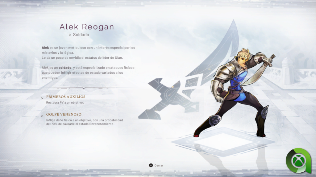 Alek Reogan. Joven meticuloso con un interés especial por los misterios y la lógica. Tiene envidia del estatus de líder de Ulan Merer. Soldado especializado en ataques físicos, pudiendo adquirir habilidades para infligir efectos de estados variados en los enemigos.