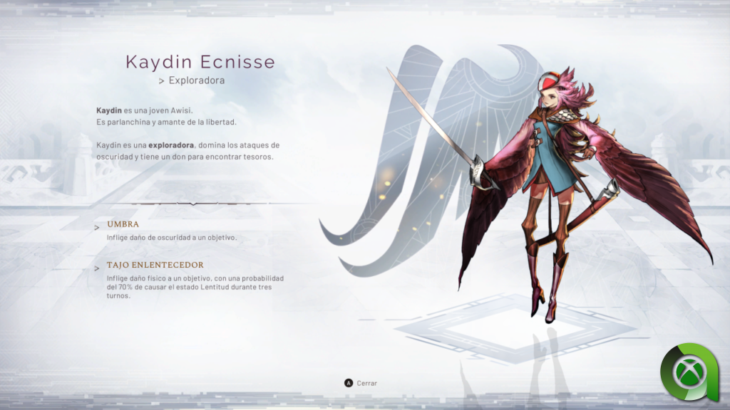 Kaydin Ecnisse. De la raza Awisi, parlanchina y amante de la libertad. Se trata de una exploradora que domina los ataques de tipo oscuridad y con un don especial para encontrar tesoros.