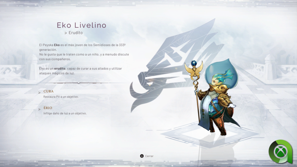 Eko Livelino. De la raza de los Peyska. Es el más joven del grupo. No le gusta que le traten como a una niño y a menudo discute con sus compañeros. Se trata de un erudito, capaz de curar a sus aliados y utilizar ataques de luz contra los enemigos.