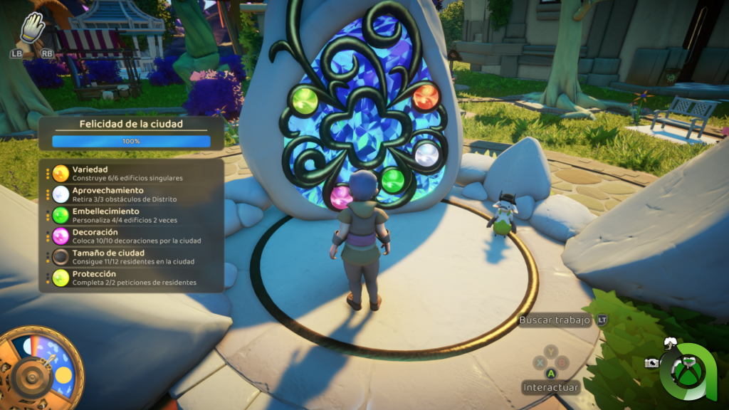 Guía será la encargada de acompañarnos en las misiones principales, secundarias, objetivos y tareas complementarias. Al acceder a ella podremos consultar todas las misiones, principales o secundarias que se encuentren activas. Del mismo modo, podremos consultar los objetivos que existen en cada una de las zonas, como podrían ser alcanzar un número determinado de habitantes, construir ciertos elementos o llegar a decorar otros tantos edificios, entre otros. Por último, consultándola también veremos una serie de tareas que podremos realizar para conseguir algunos premios como puntos de Myora o elementos decorativos o personalizaciones de nuestro personaje. Algunas de estas tareas las iremos cumpliendo siguiendo las misiones principales o secundarias, pero en otras deberemos cumplir ciertos puntos para desbloquear nuestro premio.