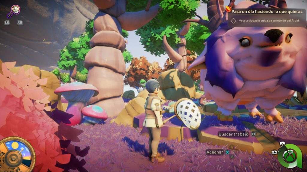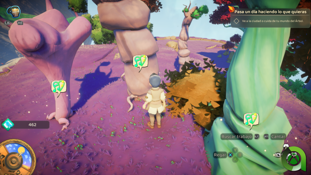 Una vez accedemos a este nuevo mundo se nos abrirán una serie de tareas. Estas tareas básicamente consistirán en eliminar toda corrupción que veamos. Nuestro objetivo diario será sembrar semillas, regar las que lo soliciten, eliminar hierbas malas de marchitamiento, destruir bloques de piedra, segar los hierbajos y expandir la canción de Myora. A parte de farmear gran cantidad de objetos o elementos que nos vendrán genial para la alquimia, ayudaremos a restaurar el bioma en el que nos encontremos. A medida que avancemos en los días, también comenzarán a crecer árboles más solidos, arbustos con frutos, y surgirán una serie de bichos y de criaturas. Con estas criaturas podremos interactuar. Con el paso de los días ganaremos su confianza y nos ofrecerán la opción de adoptarlas y llevarlas a la aldea.