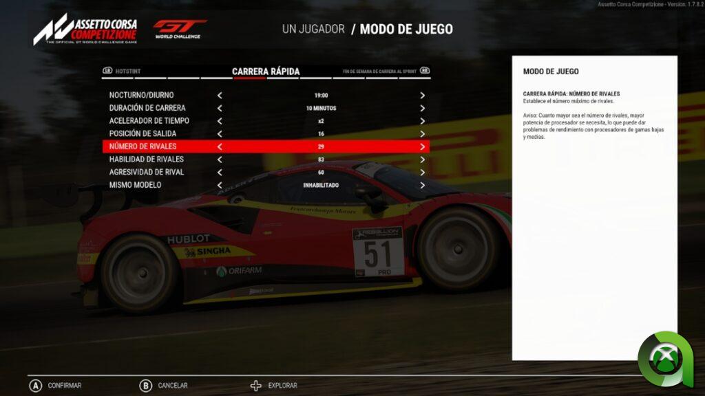 Debo aclarar que no existe ninguna opción para escoger modo rendimiento o calidad, como sucede en otros juegos. Aquí simplemente te pones a jugar y ya, el título funciona directamente a 1080p y 60fps en Xbox Series S, por lo que en Series X va igualmente como un cohete. Como matiz, he de reconocer que en una ocasión en la que estaba corriendo online y con lluvia, el juego tuvo una caída bestial en su framerate. Lluvia y carrera online con unos 20 coches, quizá por esa sobrecarga a nivel técnico, el juego se vino abajo, pero como digo solo ocurrió una vez. Algo en lo que deberá seguir trabajando Kunos Simulazioni.