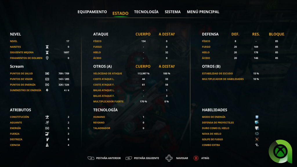 La energía, aparece representada como una barra de color azul que acompaña a la resistencia de nuestro personaje y a la vida del mismo. El consumo de energía nos permitirá atacar a distancia, aunque también nos dará la opción de recuperar nuestra salud. Esto hace que tengamos que gestionarla de forma adecuada para poder superar las dificultades de nuestra aventuras. Ahora bien, podremos recuperarla empleando baterías, las cuales actúan igual que los míticos frascos de estus de Dark Souls. Es decir, se regenerarán cuando muramos o bien cuando toquemos una baliza. Aunque no lo hemos hablado hasta ahora, las balizas tienen la misma funcionalidad que las hogueras, aunque para poder subir nivel tendremos que acudir a nuestra nave. Cabe remarcar que, como es costumbre , si morimos tendremos que ir a buscar nuestro cuerpo para recuperar nuestros consumibles.