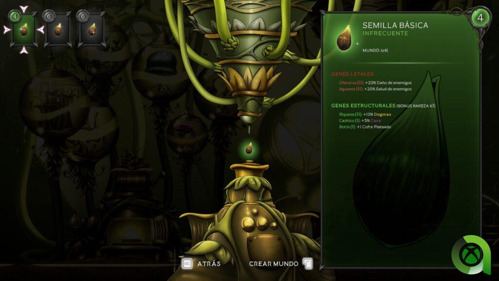 En la, llamémosla semillería, podemos hacer uso del novedoso sistema de semillas. Cada semilla se utiliza para generar un mundo que podemos explorar, con sus ventajas y desventajas. Por ejemplo, una semilla común suma un 10% a la vida de los enemigos pero nos dan un 10% más de dogmas, la moneda del juego. Tenemos varias categoría de semillas, las comunes, poco frecuentes, especiales, etc.