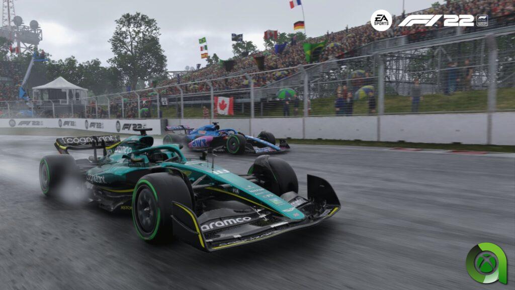 Diría que el peso es el gran protagonista en la jugabilidad del nuevo F1 22. Con coches más grandes, era obvio que tenía que influir, y vaya si lo hace. El paso por curva nos recuerda constantemente que llevamos un barco en lugar de un coche en comparación al año pasado. De hecho, también cuesta más encarar las curvas. Y si es en mojado, esa sensación se multiplica, aunque por desgracia aún queda trabajo que hacer en este aspecto. Más allá del carril seco que vamos formando en la pista y con más agarre, el resto no ofrece complicaciones en forma de charcos que puedan llevarnos a cometer un error o irnos fuera. Por no decir que la IA se mantiene excesivamente correcta, sin salirse del «camino» designado.