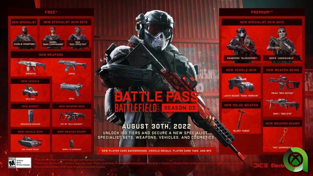 Los jugadores podrán conseguir de forma gratuita el nuevo contenido fundamental, incluyendo el nuevo especialista, armas, vehículos, cosméticos y mucho más con el Pase de Batalla de Battlefield 2042Se podrán conseguir más cosméticos a través de la versión premium del Pase de Batalla.