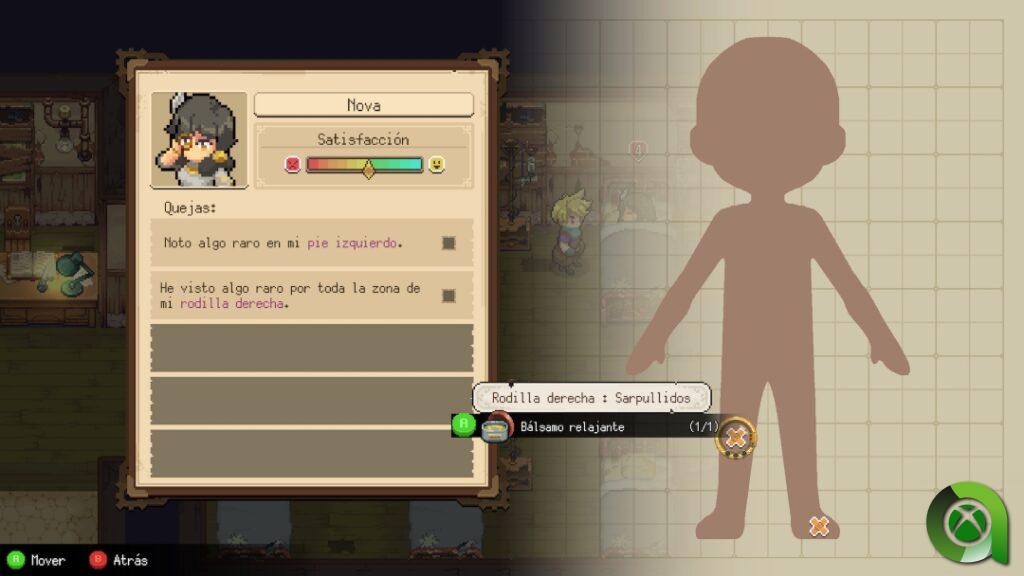 Uno de mis favoritos (y más importantes) es el que nos permite curar a los habitantes de la isla. En un edificio independiente a modo de clínica, se nos avisará cuando un paciente requiera de nuestra ayuda. Allí irán llegando poco a poco con diferentes patologías que tendremos que identificar y curar en dos pasos. En primer lugar, identificar la zona afectada y dar con el problema, activando así el minijuego, y luego crear la poción correspondiente para solucionar la patología en cuestión.
