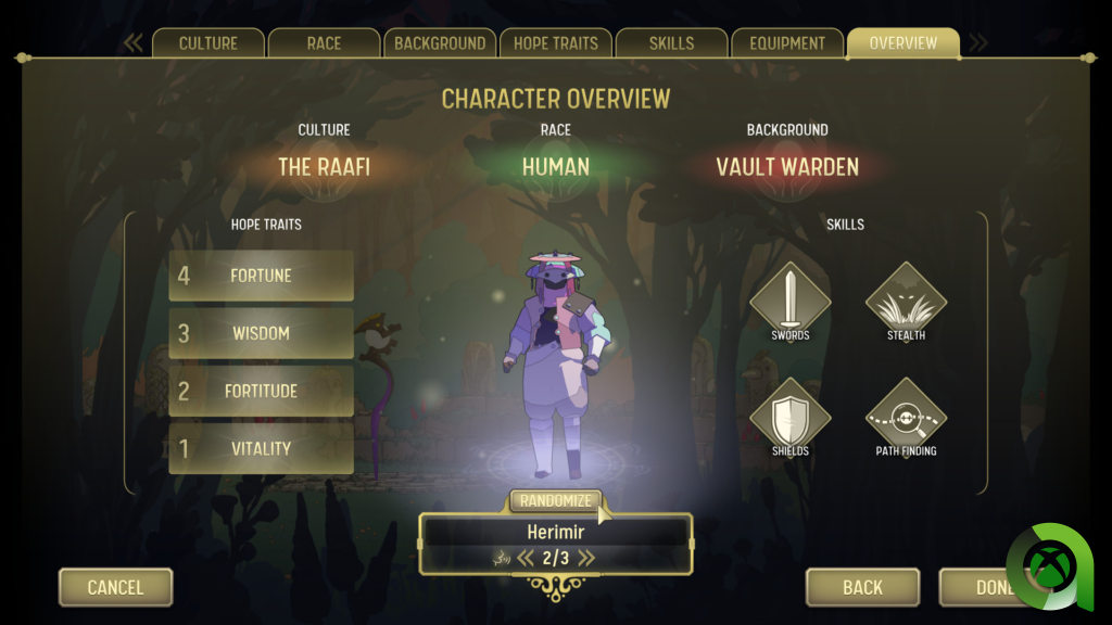 Antes de comenzar cada historia, tendremos que elegir a nuestro caminante dentro de diferentes culturas y razas. En base a la elección de nuestro personaje, tendremos unas habilidades y rasgos fijos, y otros diferentes que elegir y mejorar. Esta parte quizás es la más difícil de explicar por la cantidad de posibilidades que nos ofrecen. Todos esos rasgos pueden ir evolucionando o perdiéndose a lo largo de la historia, como el rasgo de esperanza o fortuna, entre otros.