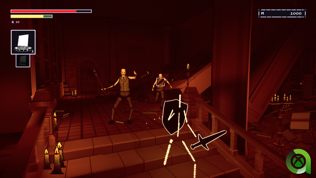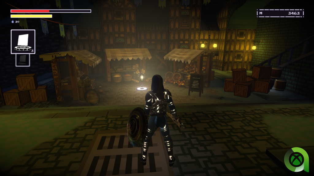 Además, estará a nuestra disposición en momentos determinados un herrero para mejorar nuestro armamento, obtener nuevas armas y armaduras. Pero aquí el juego juega, valga la redundancia, con una técnica bastante peculiar. Nuestras armas, armaduras, se encontrarán pixeladas en su primer nivel. Para «despixelarlas» e incrementar sus atributos y/o generar habilidades pasivas, deberemos encontrar los lugares donde estas perdieron su estado base. Existen armas que se complementan unas con otras, y en el caso de desbloquearlas nos aportarán habilidades pasivas más potentes.
