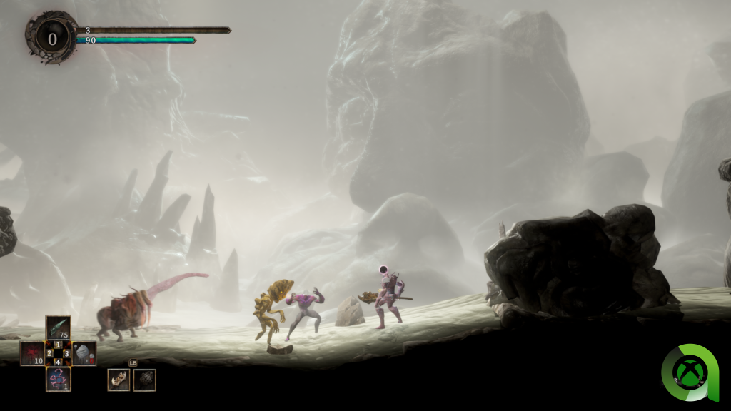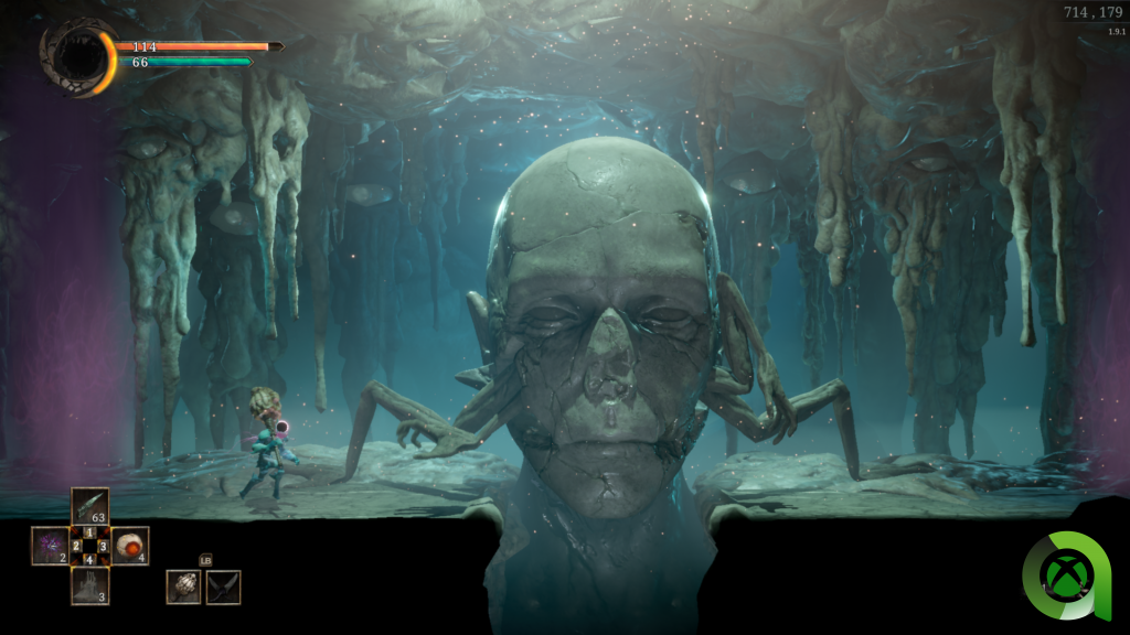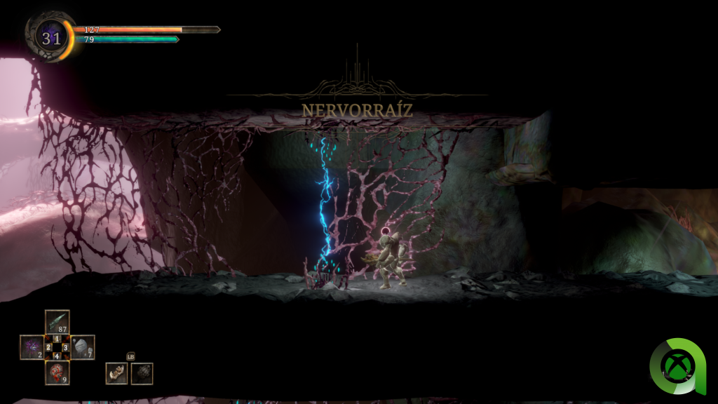 El contraataque (o «parry») es realmente importante. No se trata simplemente de una mecánica que nos permite hacer mucho daño a los enemigos, sino que gracias a ello podemos absorver a los enemigos y tendremos acceso a nuevas habilidades y mejoras. En GRIME el parry se convierte en una mecánica más que imprescindible. Disponemos de una barra de Aliento que hace las veces de la típica poción de salud, y se recarga mismamente usando el contraataque o con sustancias repartidas por el mapa que podemos absorver.