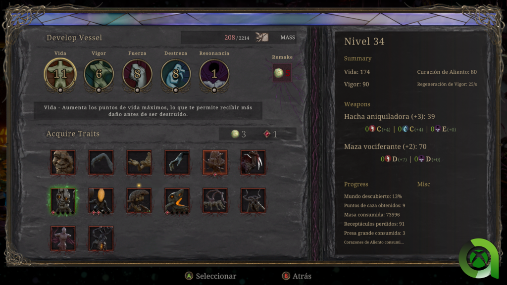 Por supuesto también hay subida de nivel de distintos atributos como la vitalidad, el vigor, la fuerza, etc. Tendréis que saber elegir qué niveles subir según vuestra forma de afrontar la aventura, pero si os arrepentís existe la posibilidad de reiniciar los niveles para corregirlos.