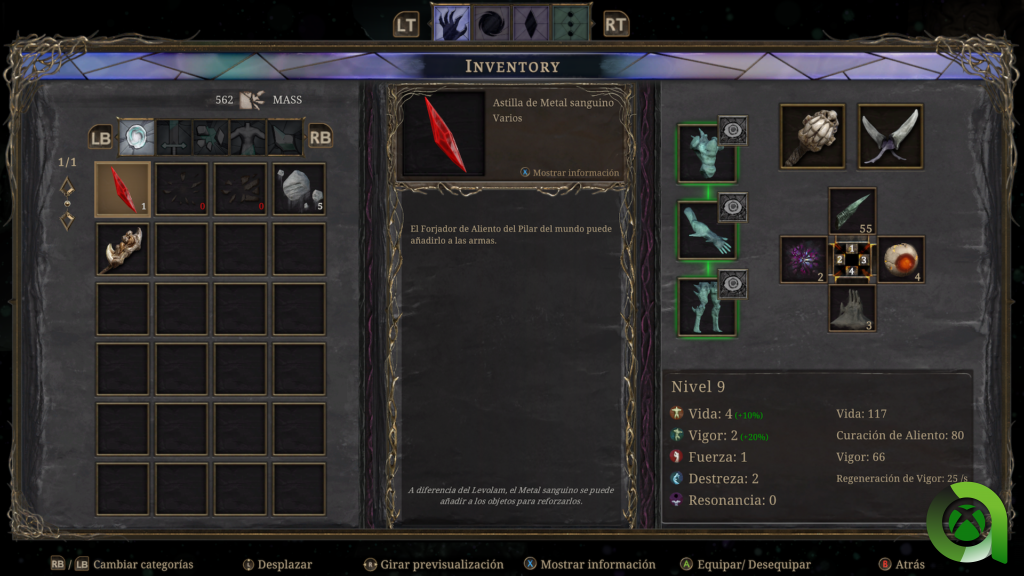 Como buen metroidvania soulslike, en GRIME disponemos tanto de diferentes habilidades importantes como de equipamiento, pudiéndose mejorar ambos.