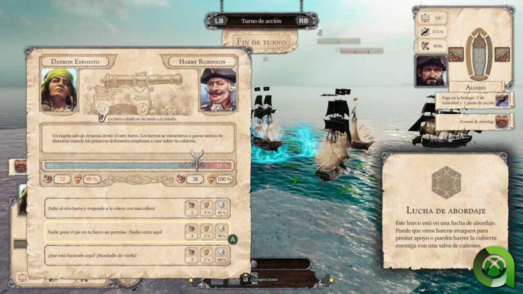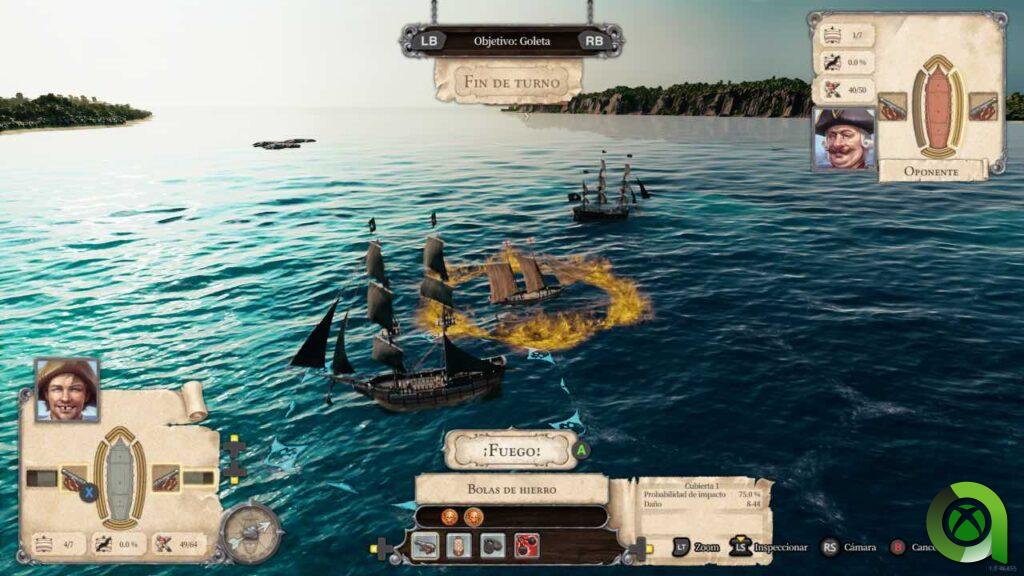 Básicamente, se trata de movernos para situar nuestra nave en una buena posición y que los cañones de babor o estribor hagan el trabajo. Podemos personalizar nuestros barcos, con cañones de distinto pesaje y potencia que afectará a la distancia y la efectividad con la que atacaremos, aparte de otros elementos, como la metralla, morteros, las defensas del barco y la propia tripulación. Tampoco faltan los abordajes, que se resuelven mediante toma de decisiones con un estilo muy rolero y una barra de porcentaje que se irá llenando según «nuestra tirada». Como hemos mencionado, es un sistema bastante simple pero a su vez divertido y adictivo.