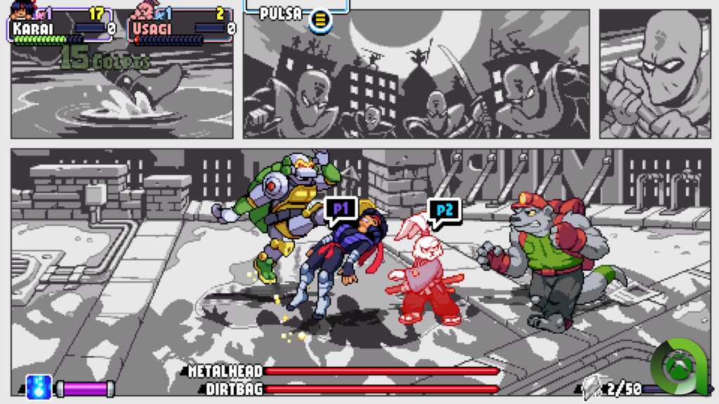 Para llevar a cabo nuestra titánica tarea, este DLC incluye dos nuevos personajes jugables bastante poderosos. Por un lado tenemos a Miyamoto Usagi, el conejo samurai. Conocido por la serie de cómics llamada Usagi Yojimbo, este conejo guerrero es el arquetipo del samurái clásico: educado, valiente, fuerte y honorable. Siguiendo la vida de un ronin, Usagi ayuda a la gente que lo necesita con honestidad y generosidad. Es el más parecido a Leonardo, compartiendo los mismos ideales y el mismo código de ética. Incluso también combate con dos espadas, una katana y una wakizashi.