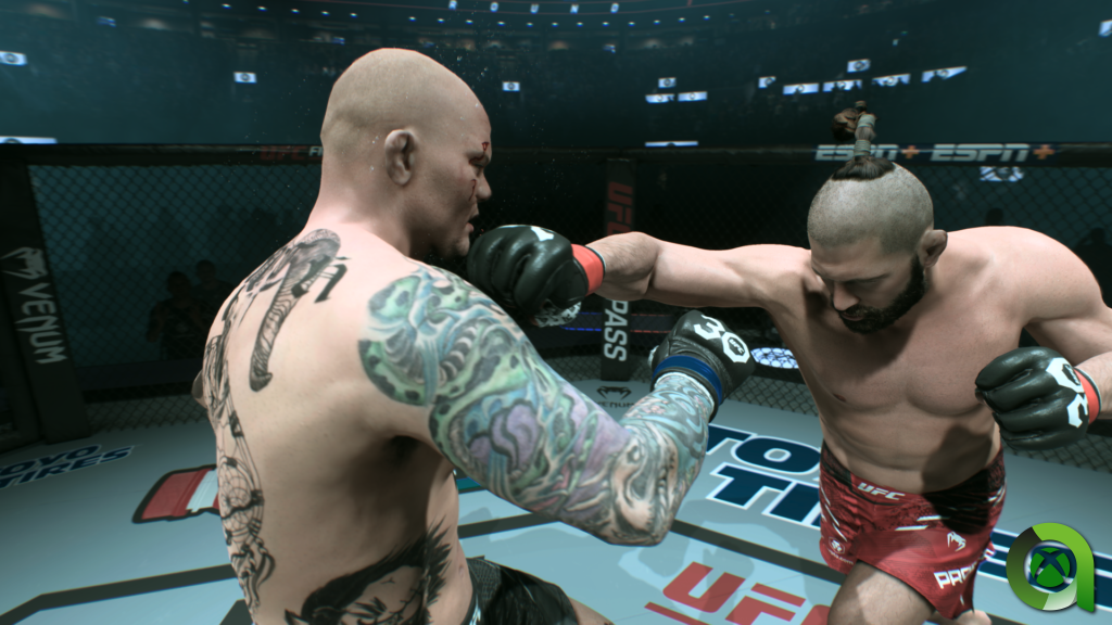 Si por casualidad estás leyendo esta reseña y no conoces la saga, podemos decir que el combate del juego se divide en tres fases: de pie, en el clinch (agarrados) y en el suelo. Cada una de ellas tiene sus propias mecánicas y opciones, que se pueden configurar según el nivel de dificultad y la asistencia del jugador. El juego ofrece una buena variedad de golpes, patadas, rodillazos, codazos, derribos, sumisiones, defensas y contraataques, que se pueden combinar para crear estrategias y aprovechar las debilidades del rival. Por desgracia, la inmensa mayoría de estas técnicas son copiadas de las de la anterior entrega. Si jugasteis mucho a este título no vais a sentir nuevas sensaciones al combatir en UFC 5.
