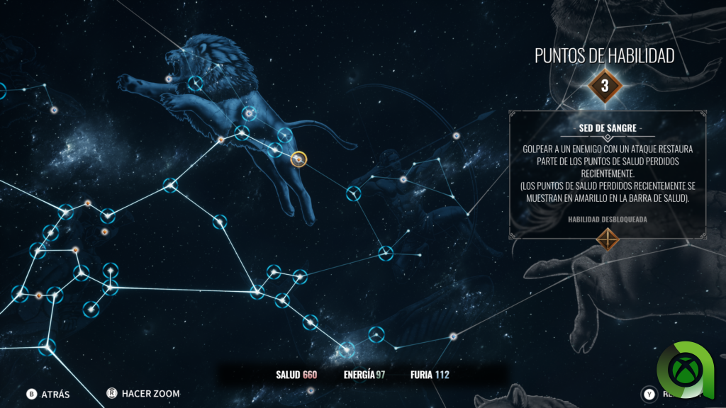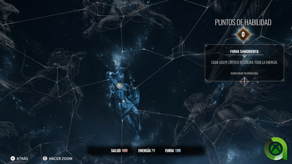 Por lo que respecta al sistema de progresión en Achilles: Legends Untold, está configurado en el desbloqueo de estrellas en un firmamento de la mitología griega. Cada estrella la podremos desbloquear con los puntos de habilidad que hayamos ganado en nuestros enfrentamientos con los enemigos o también completando misiones principales y secundarias. Estas estrellas están divididas en distintas figuras mitológicas, cada una de ellas relacionadas con una característica de nuestro héroe. Podremos encontrar puntos para aumentar nuestra salud, fuerza, ira, furia, precisión o suerte. A medida que avancemos también desbloquearemos una serie de habilidades activas o pasivas que nos facilitarán nuestros enfrentamientos.