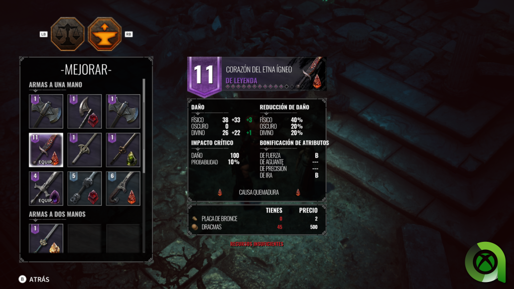 Al igual que nuestro personaje, las armas, escudos y armaduras pueden ser mejorados. Para mejorarlos deberemos de desbloquear al herrero. Este personaje se desbloquea siguiendo la historia principal. Una vez que lo tengamos a nuestra disposición, a cambio de unos dracmas y ciertos objetos, podremos ir subiendo de nivel nuestra equipación. Deberemos de tener clara nuestra elección, porque hay algunos objetos que son difíciles de encontrar o muy caros. En este sentido juega un papel importante la estrategia y decisión del jugador sobre la evolución del personaje y su jugabilidad.