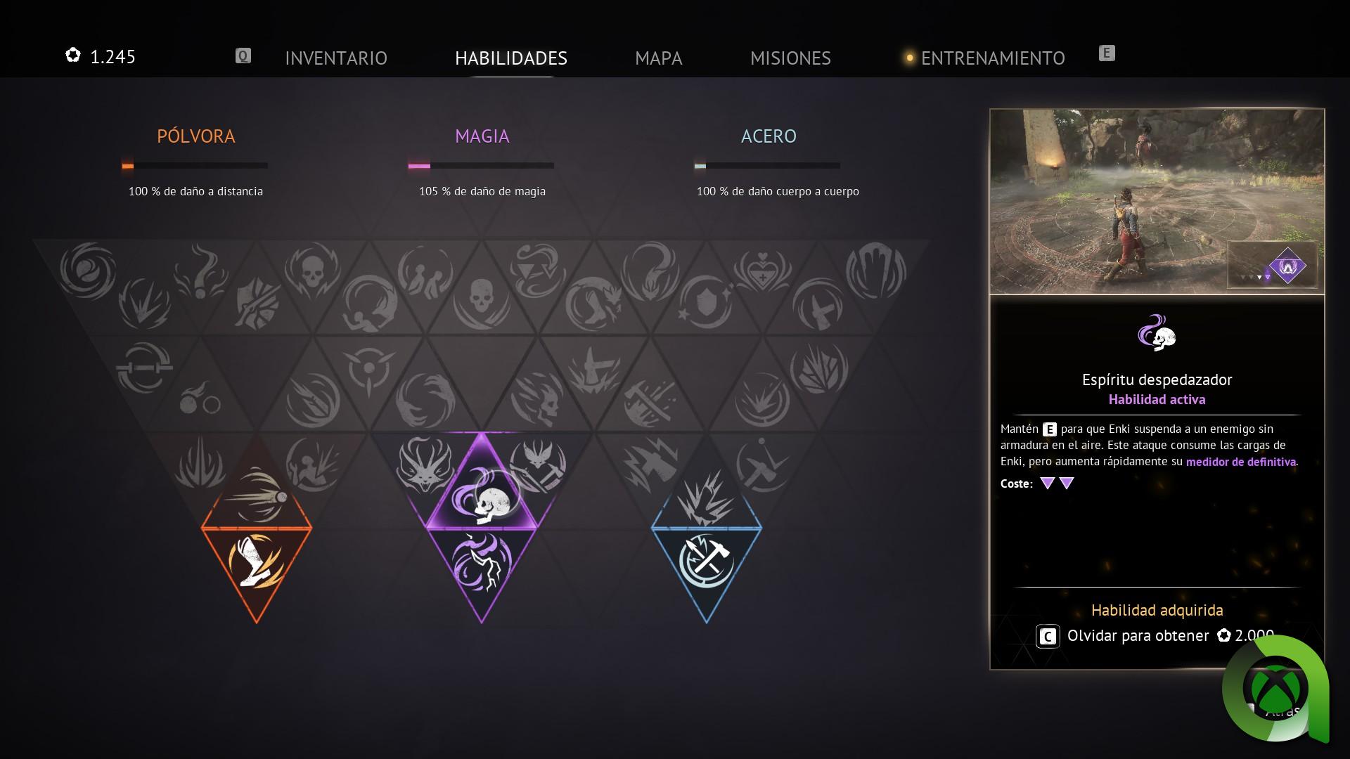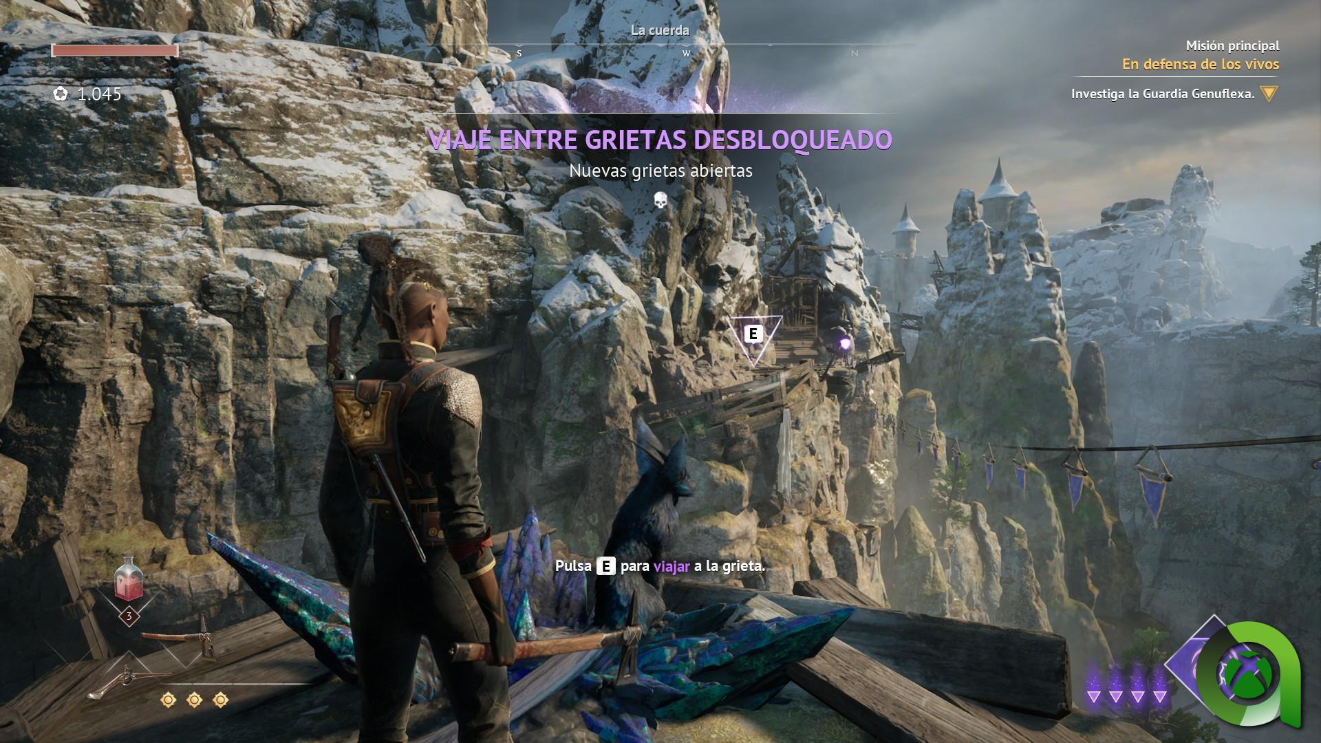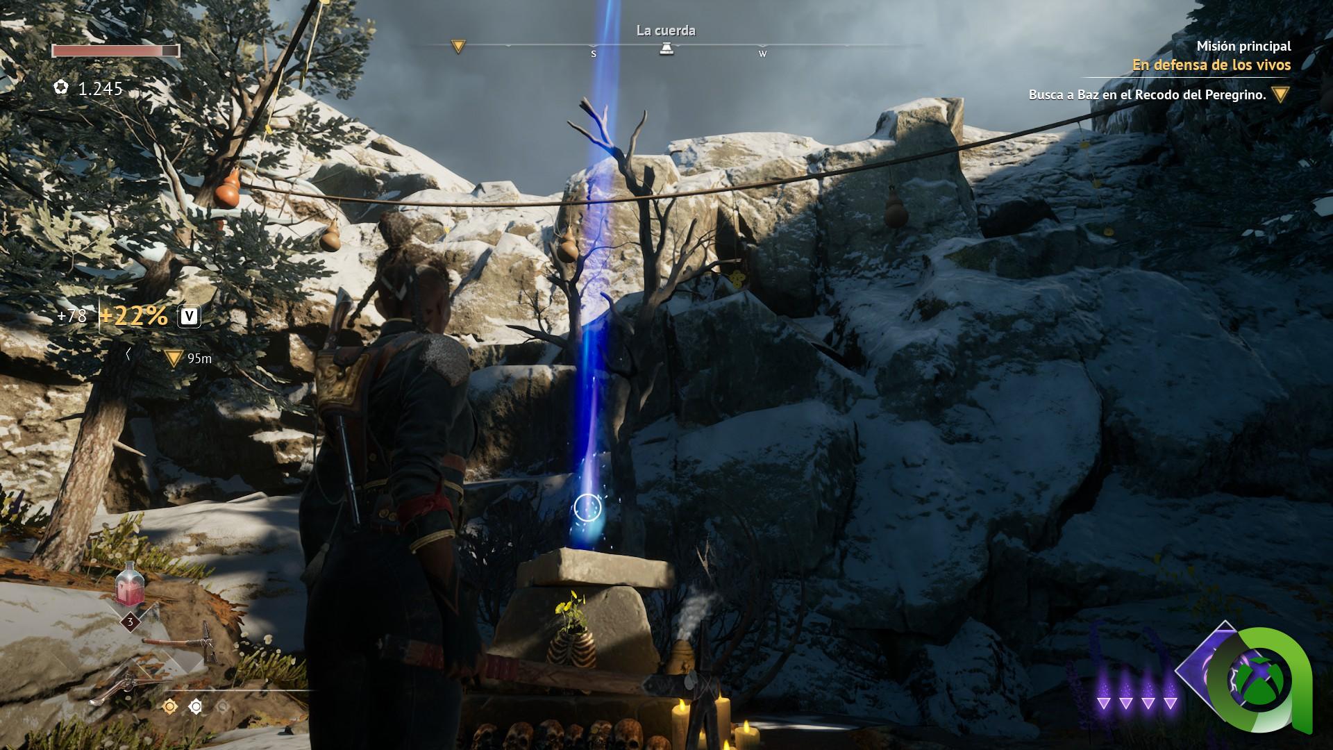El juego cuenta con dos mapas: uno que se mostrará todo el tiempo en la parte superior de la pantalla, indicando misiones y puntos de interés, y otro clásico que se irá rellenando a medida que descubrimos nuevos lugares, como los puntos de control donde podremos realizar viajes rápidos. Además, durante nuestra aventura, encontraremos una estructura con una calavera en la parte superior. Al activarla, se generan unos triángulos que nos permitirán desplazarnos a puntos anteriormente inaccesibles, los cuales podremos usar como atajos en algún momento del juego.