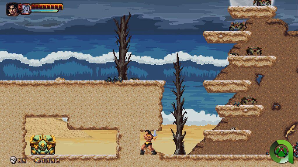 El estilo artístico elegido para Abathor es un nostálgico pixelart propio de obras que cargan más de 30 años a sus espaldas. El diseño de los enemigos, desde arañas hasta espectros o serpientes humanoides, así como el de los jefes finales, siendo uno de ellos un enorme cíclope de la mitología griega, respira un aire muy clásico. Lo mismo ocurre con los escenarios, en forma de playas, fortalezas medievales, bosques encantados… Cabe mencionar que los jefes finales se presentan al final de cada mundo (no de cada nivel) y que cada uno nos obliga a hacer uso de diferentes mecánicas, rompiendo así totalmente la monotonía para hacernos sentir que estamos ante un nuevo desafío cada vez que nos enfrentamos a uno de ellos.